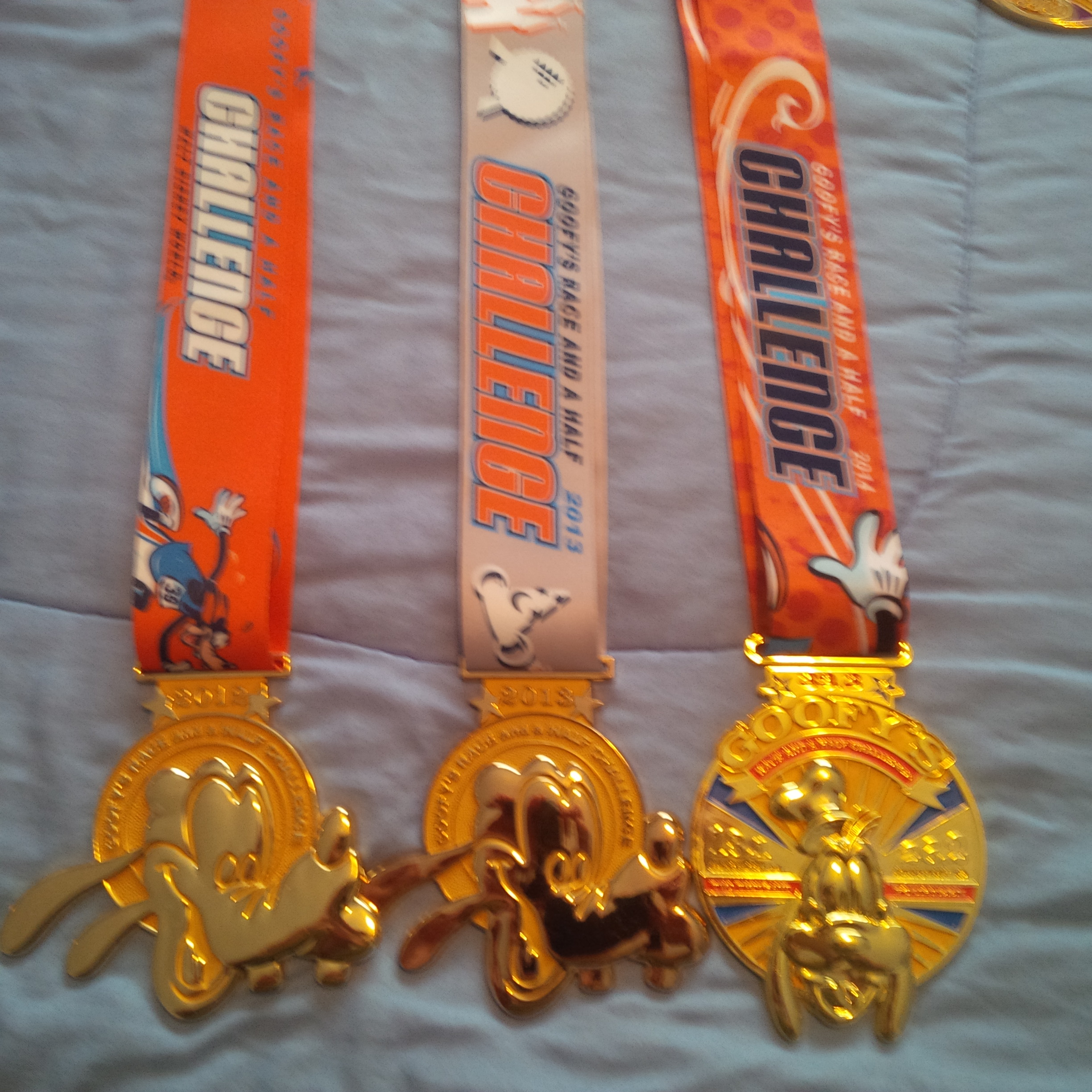 Walt Disney World Goofy Challenge Medals from 2012, 2013, and 2014