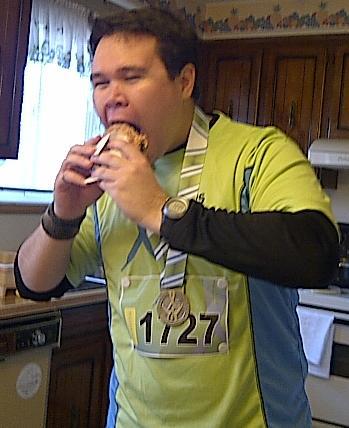 After I posted this picture on Facebook I got a lot of fun comments. My favourite was by Henry Lo who said: “OBVIOUSLY, you’re only allowed to consume this food wearing race bib and medal!”