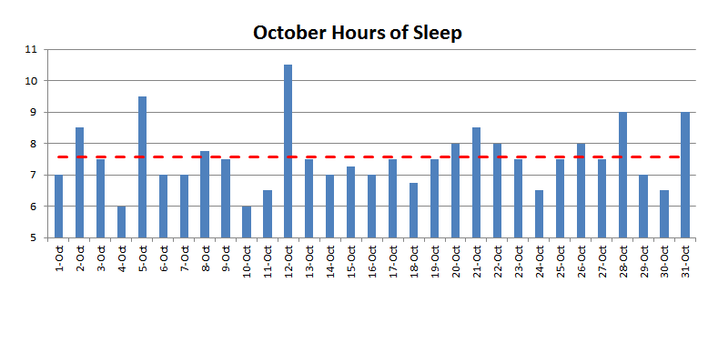 I think I’m finally getting a handle on this weight-loss business. I really do need the three-pronged approach of nutrition, exercise, and sleep. The laser-like focus I needed heading into the goal marathon certainly helped. The first couple weeks of November will probably be a write-off in this category, but once I’m back into routine I hope to continue this progress.