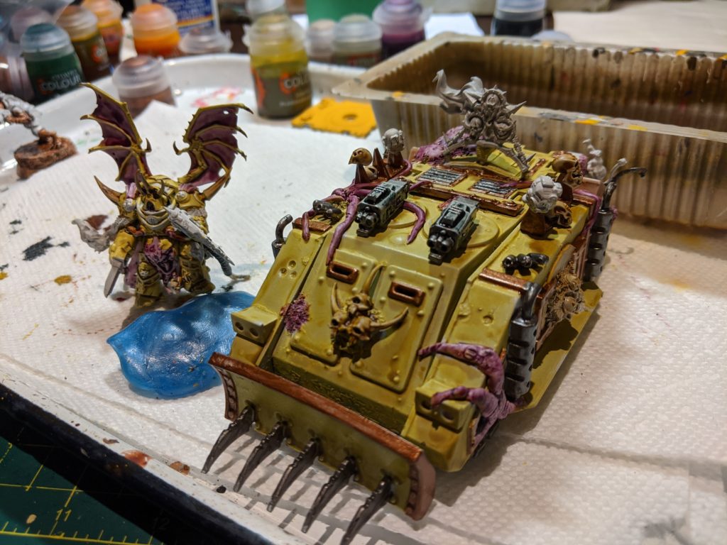 Work in progress on a Daemon Prince and Rhino tank, heavily converted by me