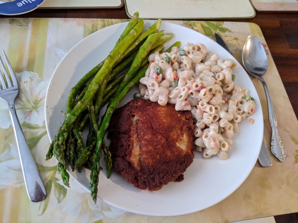 Ginger-ale fried fish with asparagus and gluten-free, dairy-free pasta