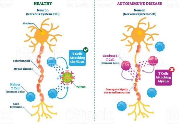 So, what causes the immune system to cause an auto-immune response? It’s a LONG story and not well understood yet. The body reacts to an infection or mock infection like vaccine. Then somehow the immune system gets “confused.” The confused immune system then starts attacking something else.