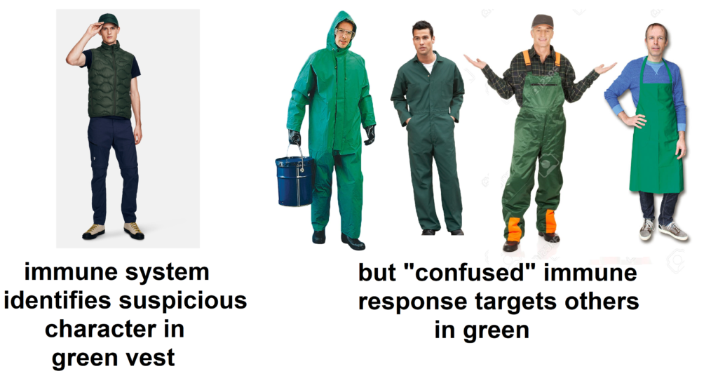 So, here’s another grossly oversimplified analogy: Imagine the immune system is like a security team. Someone on the team spots suspicious characters wearing a green vests and calls the rest of the team to help stop them. However, imagine the security team just finished a double shift, their coffee has run out, or for some other reason they aren’t at 100%. The security team might miss these intruders in the green vests. Or, worse, in their confusion, start apprehending anyone and everyone wearing green! This is where the immune system is mistakenly targeting the wrong, “innocent” cells.