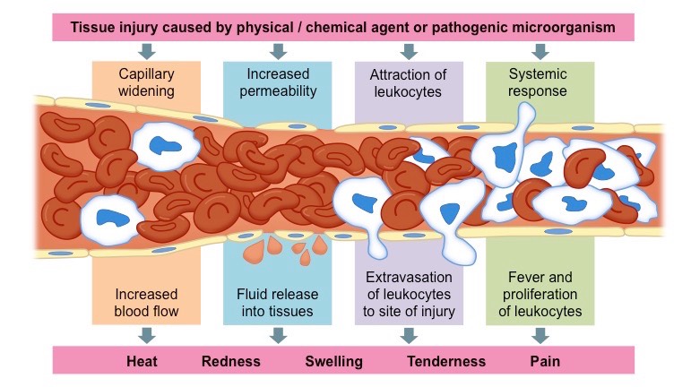 One of the immune systems responses to an infection is called inflammation. This is actually a collection of responses where the local blood vessels and capillaries dilate, temperature increases, and all sorts of chemicals and “infection-fighting” cells make their way to the infection site. And “signals” are sent for “reinforcements” so the body makes more cells and chemical to keep fighting the infection. Eventually, a “message” is sent by “regulatory” elements that the fight is over. Then the body “remembers” what worked so that it can use the same techniques again. So, inflammation usually helpful albeit uncomfortable, unless the “target” isn’t actually sick.